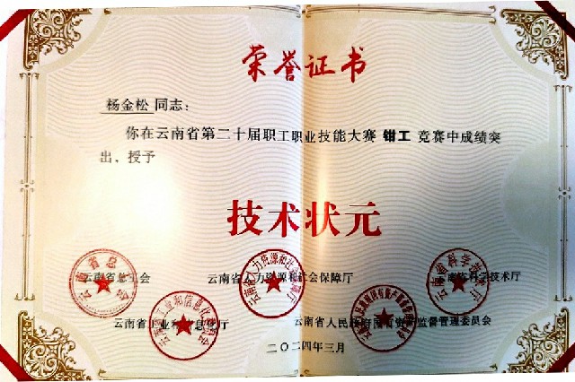 作為啟動儀式的一項主要議程,云南省總工會、云南省人力資源和社會保障廳、云南省科學技術廳等單位聯合,對云南省第二十屆職工職業技能大賽各工種獲獎選手進行隆重表彰。昆船機械公司職工楊金松在鉗工技能競賽中獲得第一名,被授予“技術狀元”稱號。