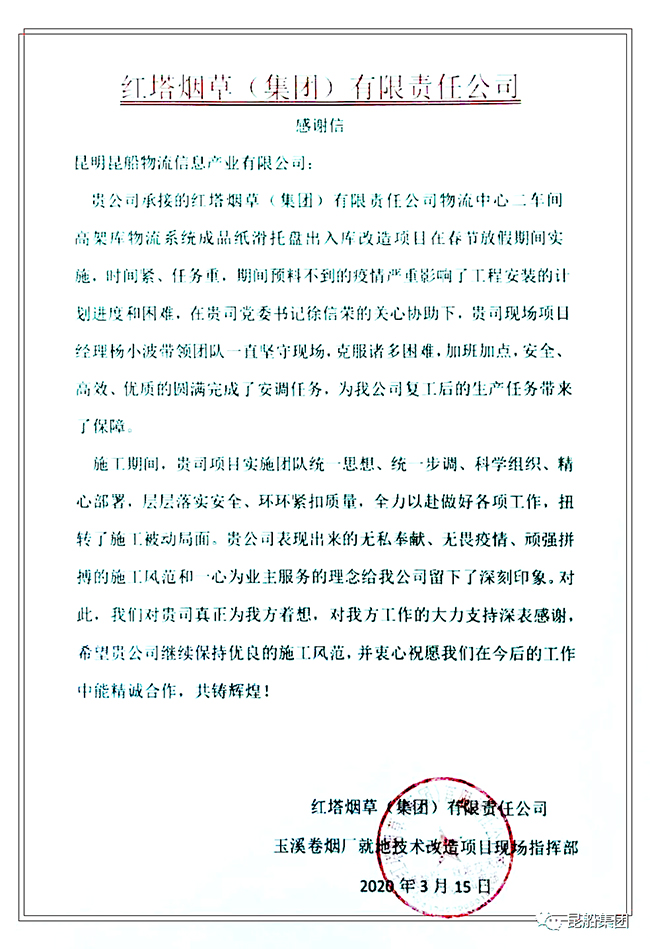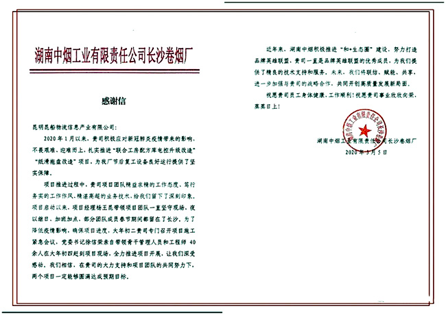 在疫情爆發之際,在春節假期之時,昆船物流公司領導、技術骨干紛紛組成突擊隊,奔赴玉溪卷煙廠、長沙卷煙廠等地,保障項目節點按期完成,他們的不畏困難、不提條件、主動請纓的精神深深的打動著所有人。