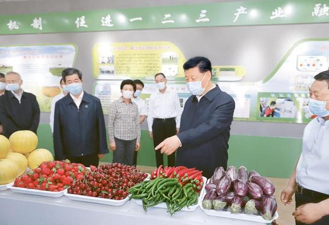 2020年6月8日至10日,中共中央總書記、國家主席、中央軍委主席習近平在寧夏考察。這是6月9日下午,習近平在銀川市賀蘭縣稻漁空間鄉村生態觀光園,了解寧夏現代農業發展和特色農產品情況。 新華社記者 鞠鵬/攝